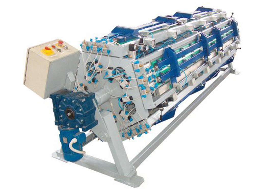 The press is constructed in the form of a pentagonal rotating frame, set on two brackets. The rotating frame is a spatial construction welded from closed sections. Five loading fields can be found on the frame perimeter. The floor panel is pressed by each field once. Three frontal actuators are located in each field, along with a longitudinal board with six side pressing actuators, hoses filled with compressed air for the upper press, and three actuators raising the glued panel. The actuators are controlled by two pneumatic dividing valves, located on each field. After loading the field with new material (frontage), the section is closed and the rotating frame is turned to the next field. Activation of frame rotation is done by pushing a button on the console. The frame is turned by a motoreducer set on the frame shaft. The frame stops automatically after the induction sensor activates.