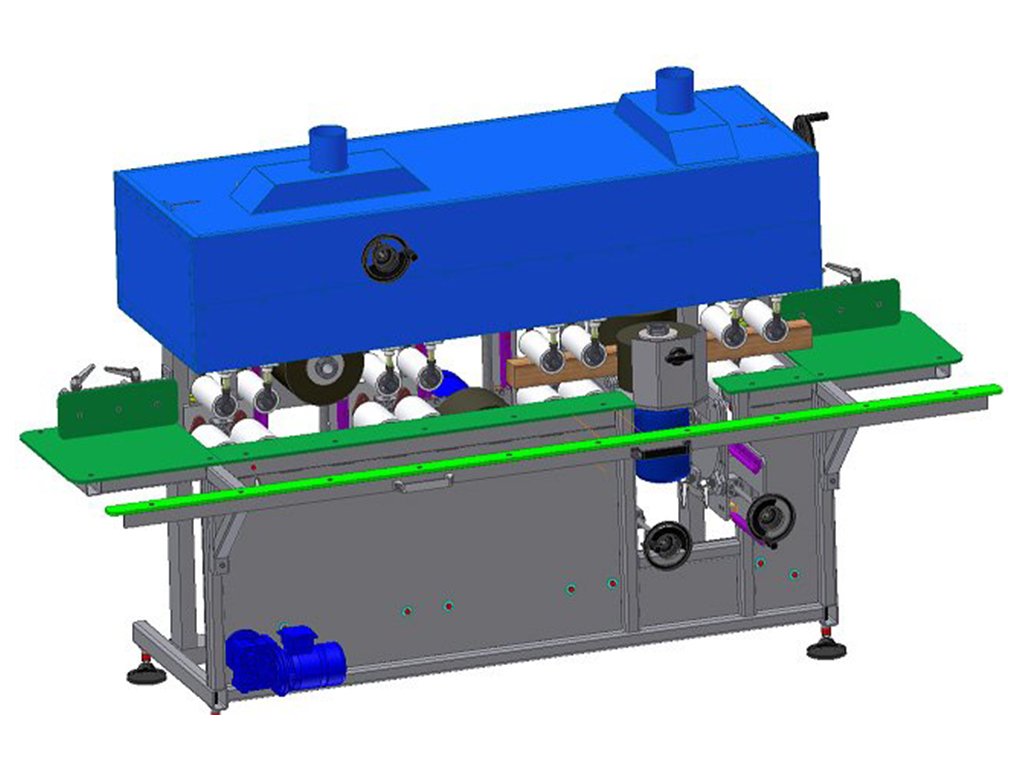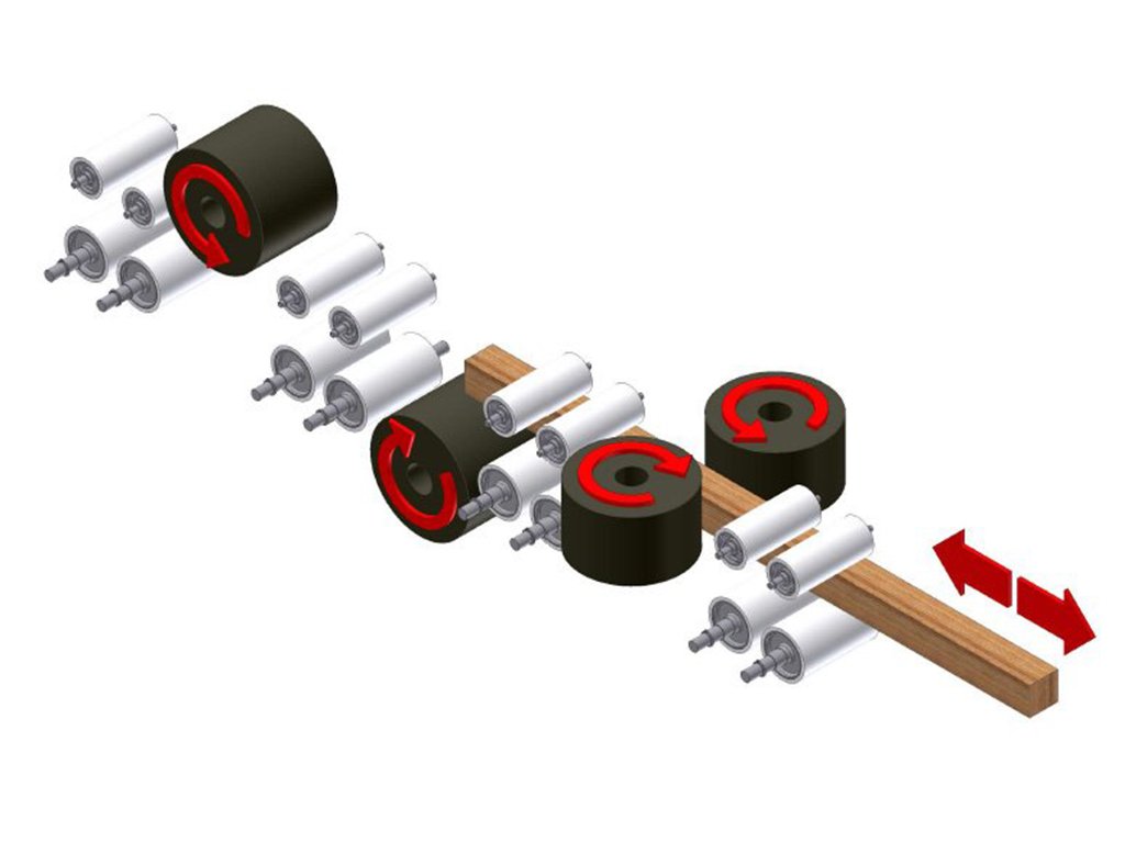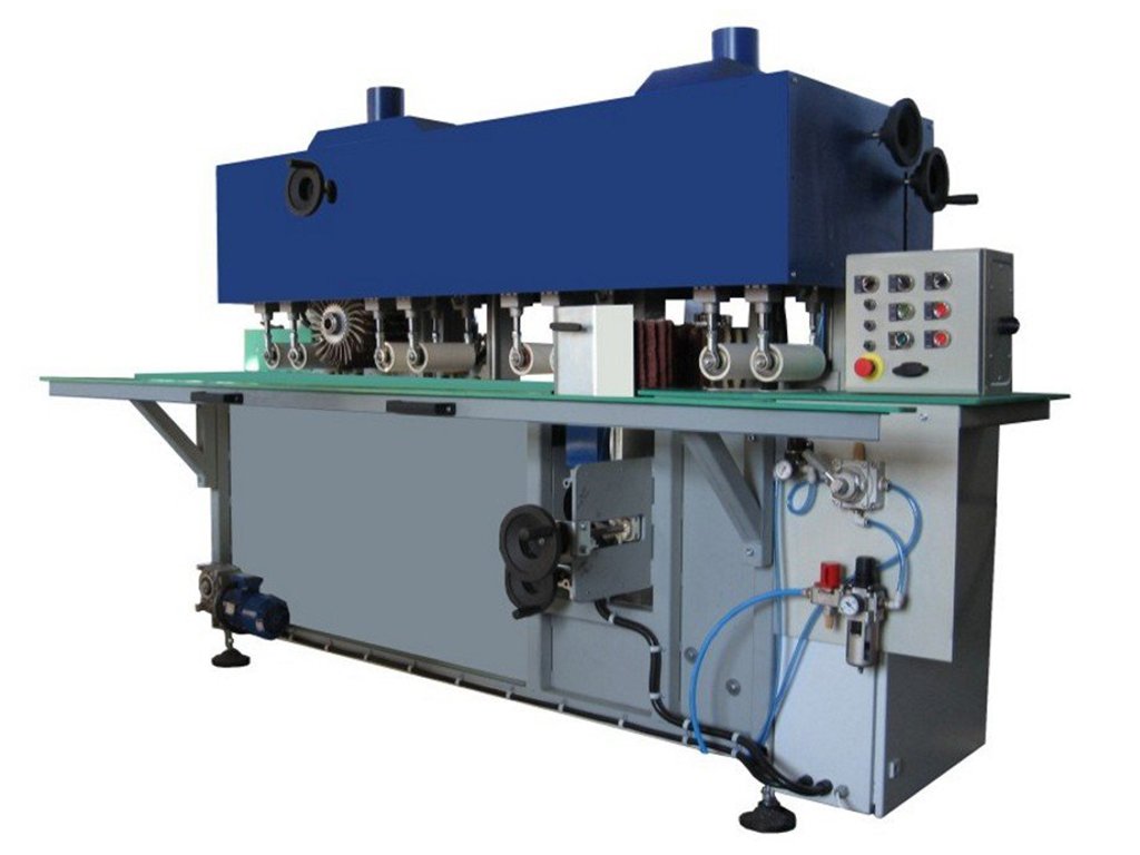 The brushing-sanding machine is designed for the four sided passing sanding and dusting of the wooden surfaces of sills and window frames. The machine has individual drives for brushes. The feed mechanism has a separate drive. Dust is removed by exhaust fans to an individual extractor or to the central extraction grid. The brushing – sanding machine has a regulated rate of advance for brushed elements in the range of 5-20 m/min. Also possible is a reverse work variant. The rotational brush speed is regulated in the range of 300 to 1000 rpm. Adjusting working brushes and the height of brushed elements is done by hand operation. The construction of work heads makes the quick replacement of individual cleaning segments possible.